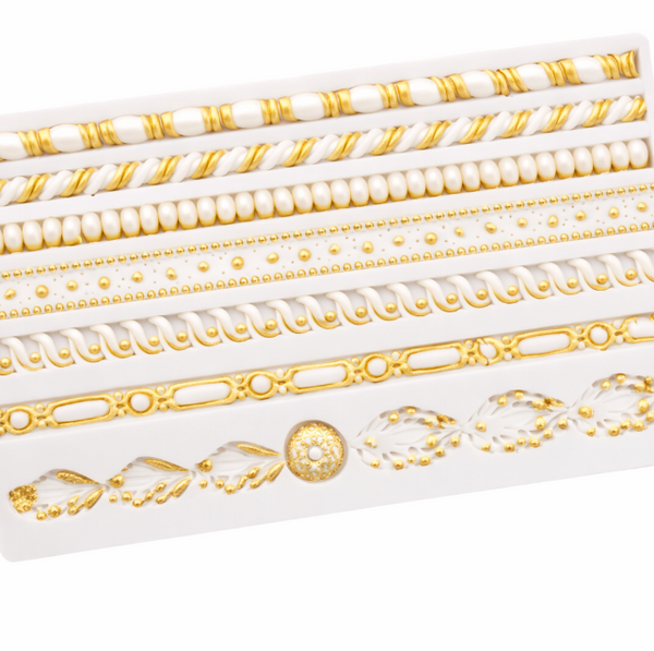 Add timeless elegance to your creations with our Elegant Border & Trim Silicone Mold, which creates crisp, decorative borders and embellishments. This versatile mold features multiple classic trim styles, including pearls, rope twists, braids, scallops, beaded borders, and ornate accents—perfect for refined and luxury designs.