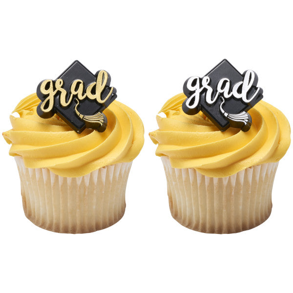 Celebrate the graduation season with these gold and silver grad rings. Great for cupcakes, donuts, or even finish off the look of a cake.