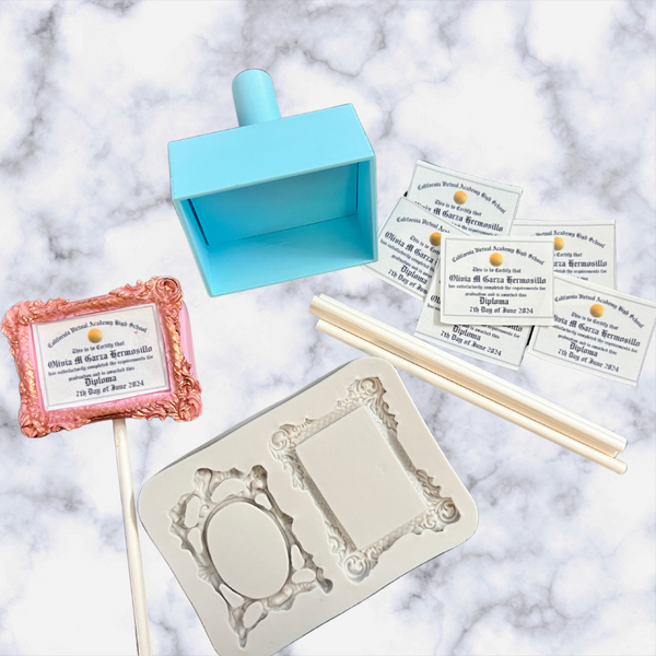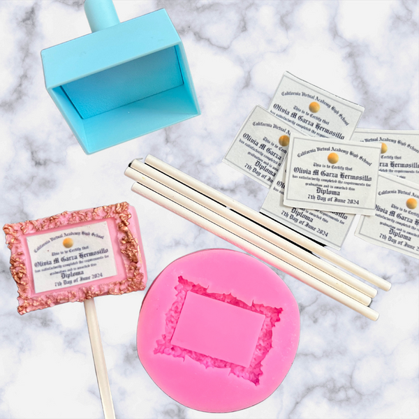These Graduation Cake Pop Kits are perfect for creating a delicious and unique treat for any graduation celebration. Each kit comes with one sheet of diplomas edible images non-custom, a Silicone Mold, and a 3-D Printed Cake Pop Mold, you have all the necessary tools to make your own graduation-themed cake pops with ease.