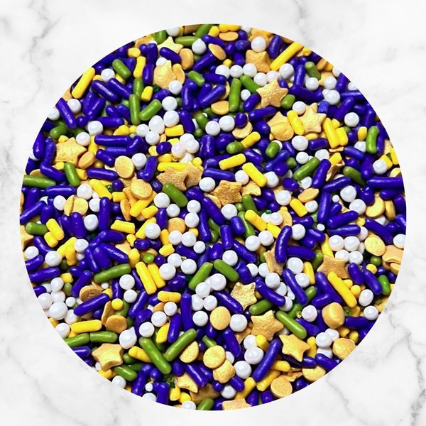 Transform your baked goods into carnival masterpieces with this delightful 2 oz sprinkle collection. Housed in a convenient reusable bag, this festive blend adds a splash of Mardi Gras magic to cupcakes, brownies, and treats galore. Bring the parade to your dessert table and watch your creations steal the show!
