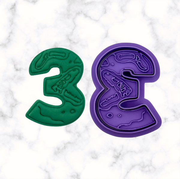 Get ready for prehistoric fun with the Dinosaur Number 3 Cookie Cutter and Stamp set! Perfect for little explorers, this playful collection sparks imagination and adventure. Bring the ancient world to life and watch creativity roar!! Choose from sizes 1.75, 2.0, 2.5, 3.5, and 4.0 inches—perfect not only for cookies but also for fondant on smaller treats. Each set includes one cookie cutter and a matching stamp. Made from food-safe PLA, it’s easy to clean with warm water. The 2.5-inch size shown gives you a tasty idea of what’s possible!