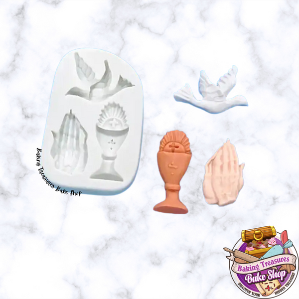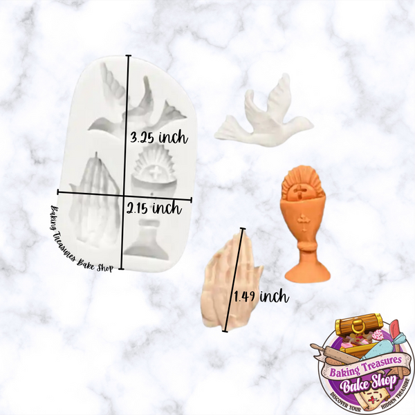 Baptism Silicone Mold's dimensions can be seen in the pics! Perfect for topping your choc-covered Oreos or cupcakes, this mold's ready to roll with choco, fondant and gum paste.